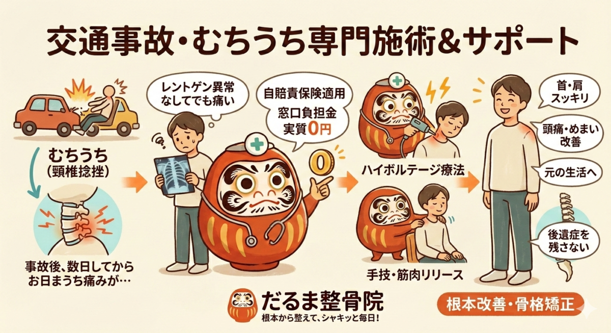 【交通事故】むちうちを放置しないで!だるま整骨院が教える症状と根本改