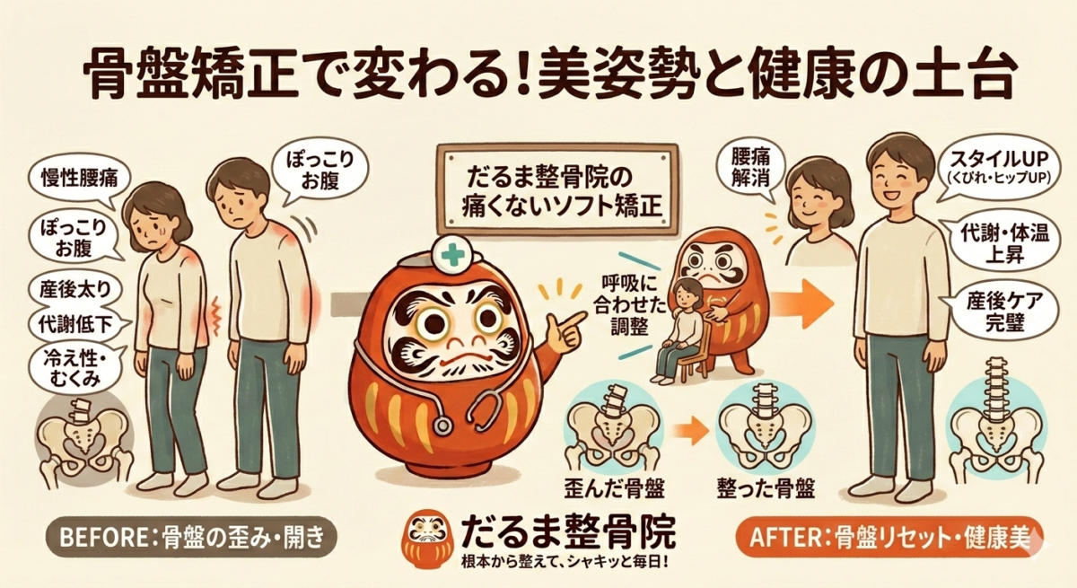 【骨盤矯正】痩せにくい・腰痛の原因は?だるま整骨院の痛くない根本ケア