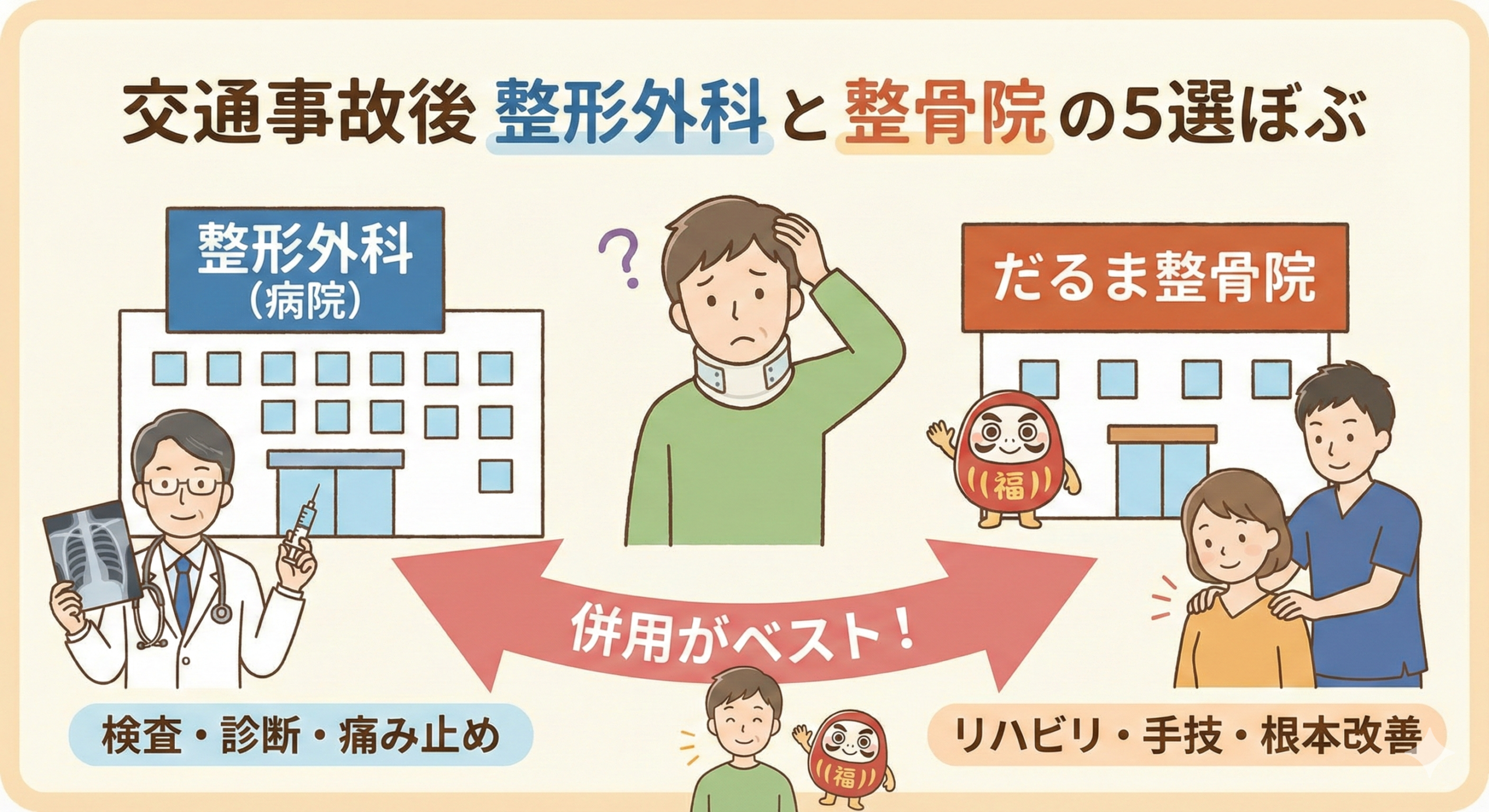 - 【交通事故】整骨院と整形外科の違いとは?併用するメリットと正しい通い方を解説