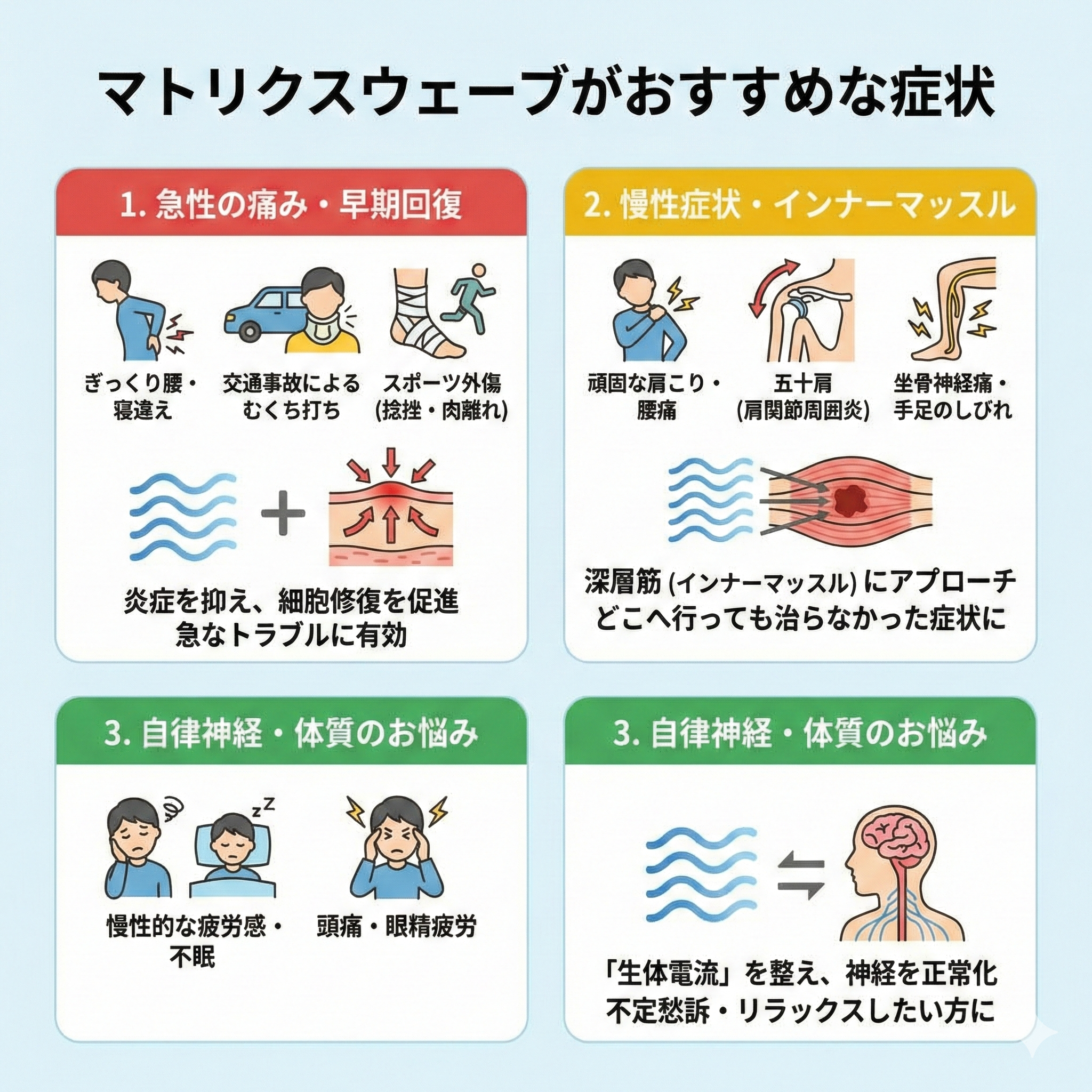 マトリクスウェーブは身体の深部(インナーマッスル)や神経系へ直接アプローチできるため、以下のような症状に特に効果を発揮します。