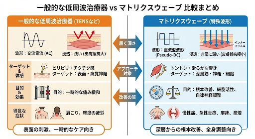 「直流に近い特殊な波形」を用いることで皮膚抵抗を最小限に抑え、指圧や一般的な電気治療では届かない深部のコリを効率よくほぐします。